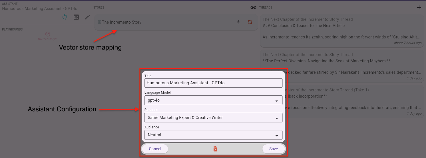 - Creative Writing Assistant: This example sets up an assistant that specializes in creative writing and has been provided with context from multiple blog posts uploaded as documents to the associated vector store .
