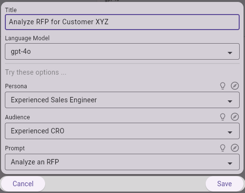 - AI RFP Analysis: This example analyzes an RFP that you provide via file upload by having AI take the role of an experienced sales engineer and frames the analysis for a Chief Revenue Officer (CRO).