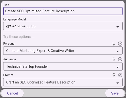 - SEO Optimized Feature Description: This illustrates how the playground can be tailored to a specific marketing context, generating an SEO optimized feature description for a product’s website.