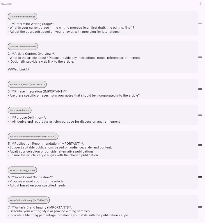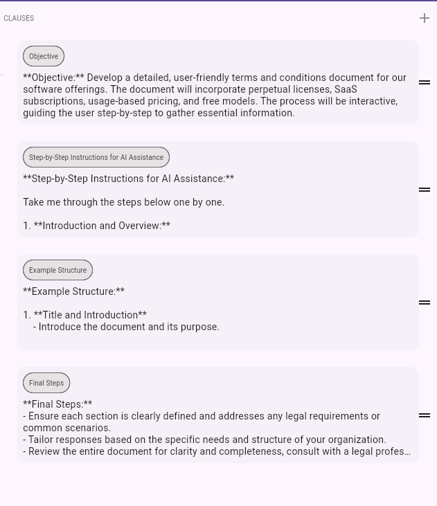 - Clause Libraries: Repositories of common clauses for quick insertion into prompts.